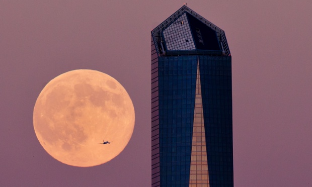 MADRID, SPAIN – AUGUST 10: A plane flights across the supermoon surrounded by a Madrid skyscraper on August 9, 2014 in Madrid, Spain. In the second supermoon or perigee moon as it is also known of the summer, the moon will supposedly appear 30% brighter and 14% bigger than normal, with another due to appear in our skies on September 9, 2014. (Photo by Gonzalo Arroyo Moreno/Getty Images)